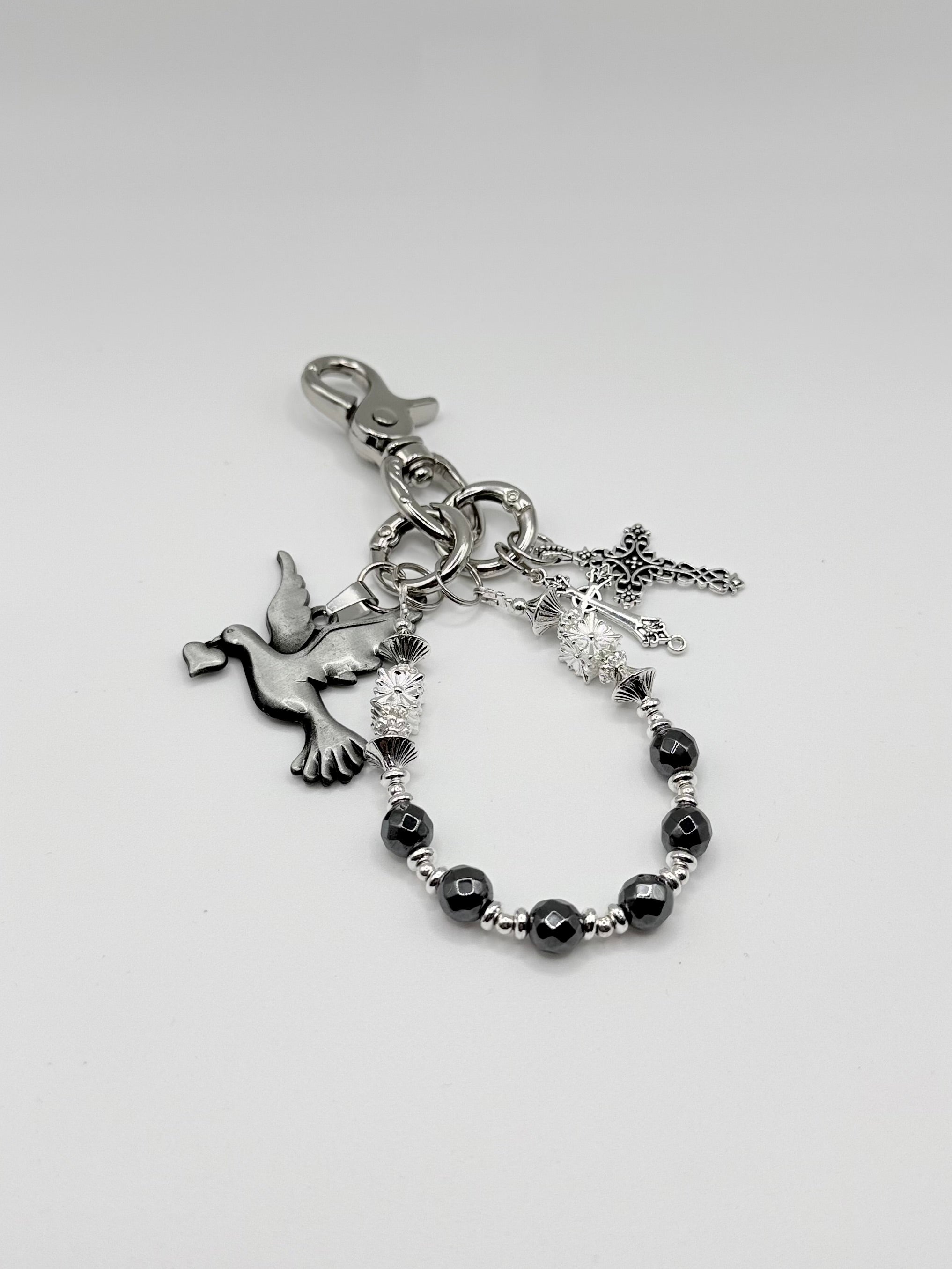 Besonderer Anhänger in Silber-Optik mit Symbolen (Kreuz, Taube, Feder) und schwarzen Perlen-Details.